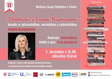 Pozývame vás na stretnutie s Ivanou Havranovou. Vyštudovaná žurnalistka pracovala a profesionálne rástla v redakcii Smena a Zornička. Pracovala aj v Československej televízii ako publicistka mládežníckeho magazínu Televízny klub mladých, neskôr si založila vlastné vydavateľstvo a vydávala časopisy. Je autorkou viac ako 400 televíznych scenárov a napísala 50 kníh. V súčasnosti je šéfredaktorkou časopisu Praktická Slovenka. Moderátorkou bude Alena Beňová, hudobným hosťom Lívia Doležalová.