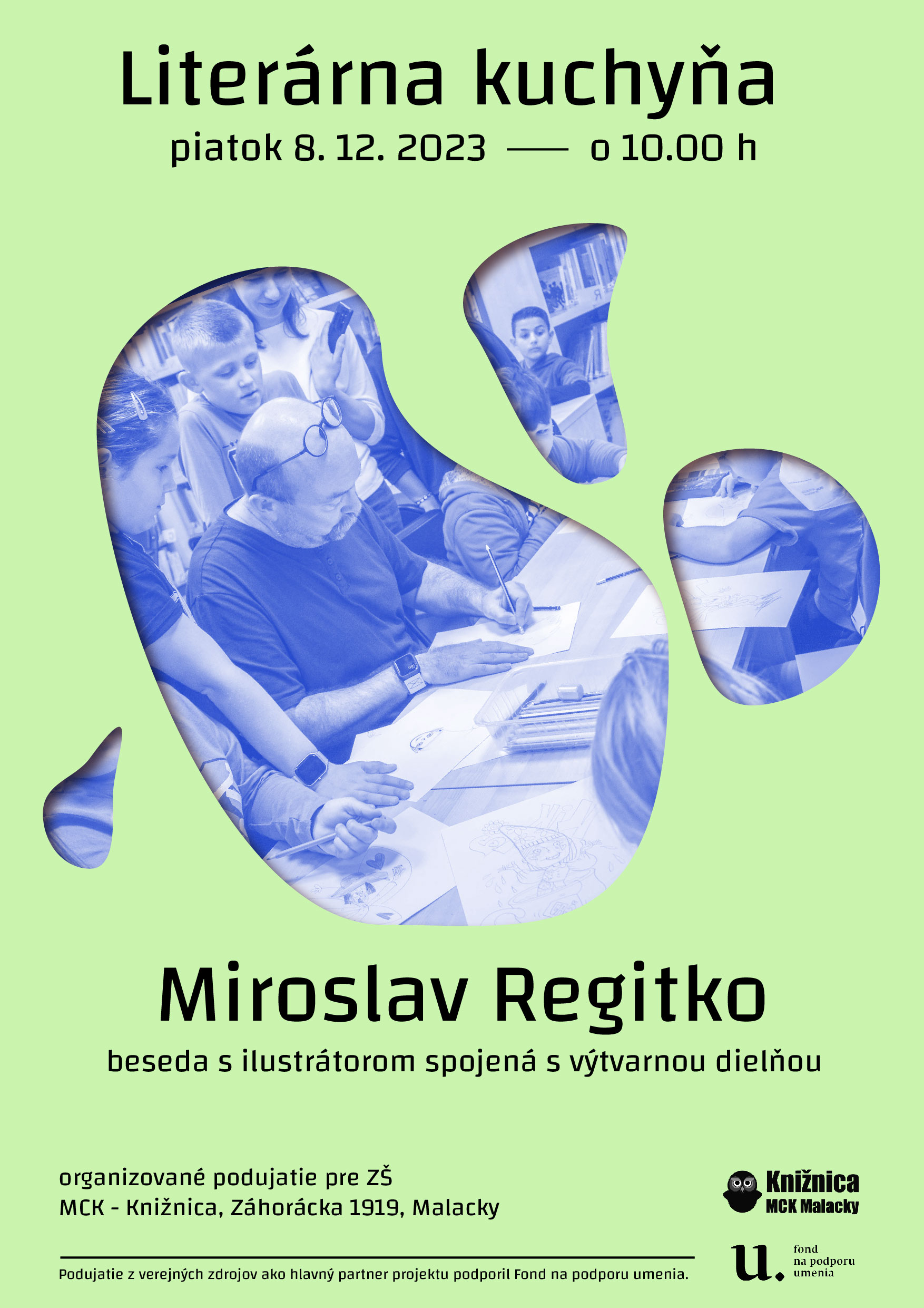 Knižnica MCK Malacky v Literárnej kuchyni namieša prvú zimnú výchovno-vzdelávaciu kašu, ktorá podporuje čitateľskú gramotnosť, čiže trávenie kníh u detí a mládeže a ich záujem o literatúru. Pripravili sme pre žiakov organizované stretnutie s grafikom a ilustrátorom Miroslavom Regitkom. Pod jeho vedením si deti vyskúšajú na vlastnej koži, aké to je, zhmotňovať svoje predstavy o príbehoch na stránkach papiera.