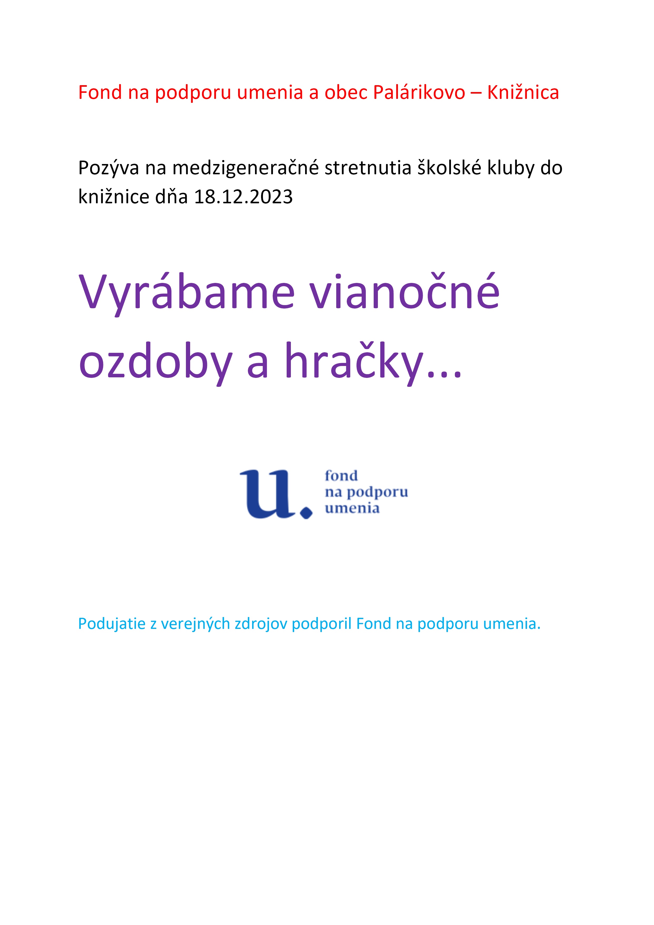 Posledným medzigeneračnými tvorivými dielňami bude výroba vianočných ozdôb a hračiek v spolupráci so školskými klubmi.