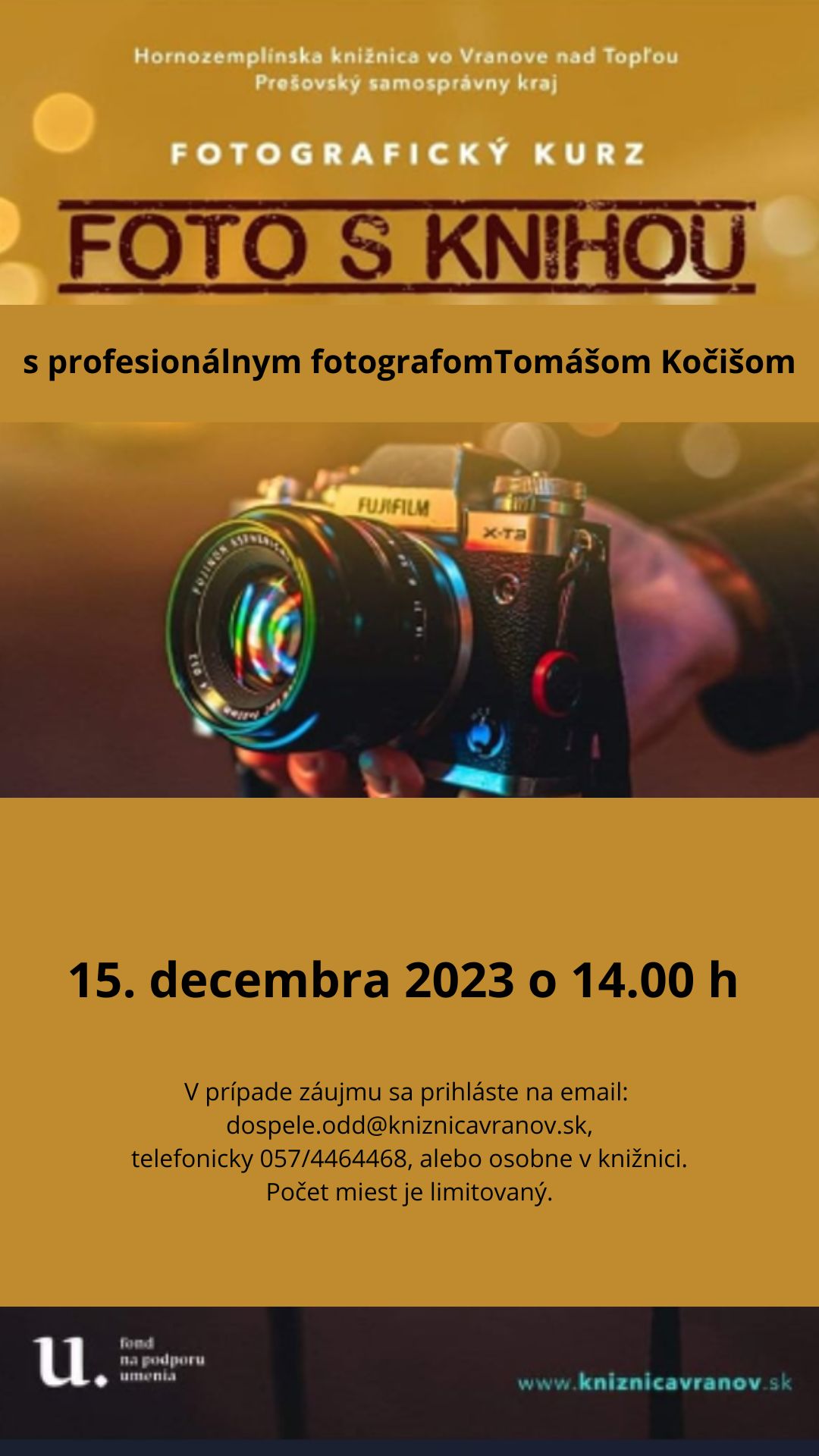 Hornozemplínska knižnica vo Vranove nad Topľou, Prešovský samosprávny kraj Vás pozýva na fotografický kurz ?FOTO S KNIHOU? s profesionálnym fotografom Tomášom Kočišom, ktorý sa uskutoční 15. 12. 2021 o 14.00 hod.