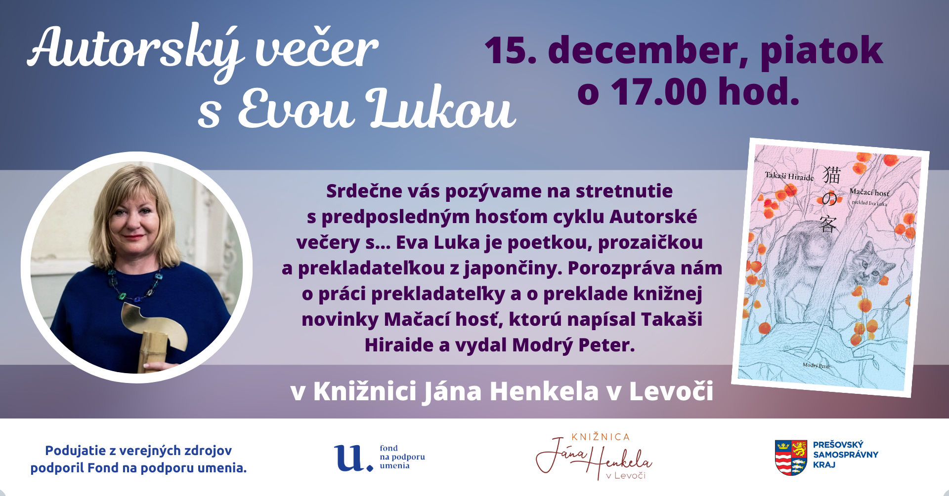 V rámci projektu Autorský večer s... pripravujeme stretnutia so slovenskými spisovateľmi a prekladateľmi s cieľom propagovať súčasnú slovenskú i zahraničnú literatúru. V decembri prijala pozvanie do našej knižnice spisovateľka a prekladateľka Eva Luka. Porozpráva nám o preklade knihy Mačací hosť, ktorú napísal japonský autor Takaši Hiraide.