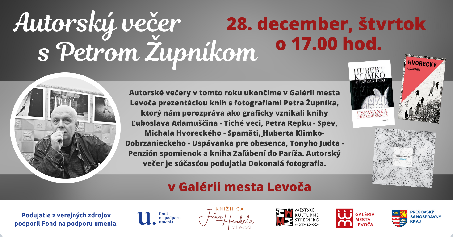 V rámci projektu Autorský večer s... pripravujeme stretnutia so slovenskými spisovateľmi, prekladateľmi či ilustrátormi. Na záver roka nám fotograf Peter Župník porozpráva o knižných fotografiách a grafickej príprave kníh.