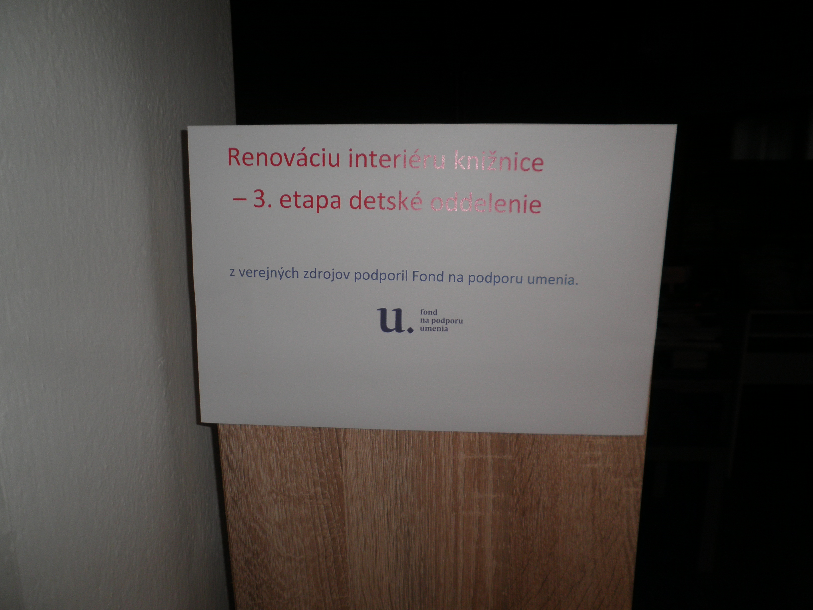 Realizujeme renováciu interiéru knižnice-3. etapa detské oddelenie nákupom interiérového zariadenia , sú to kreslá, stolíky, lampy, podsedáky...Objednané máme knižné regále, ktoré očakávame.