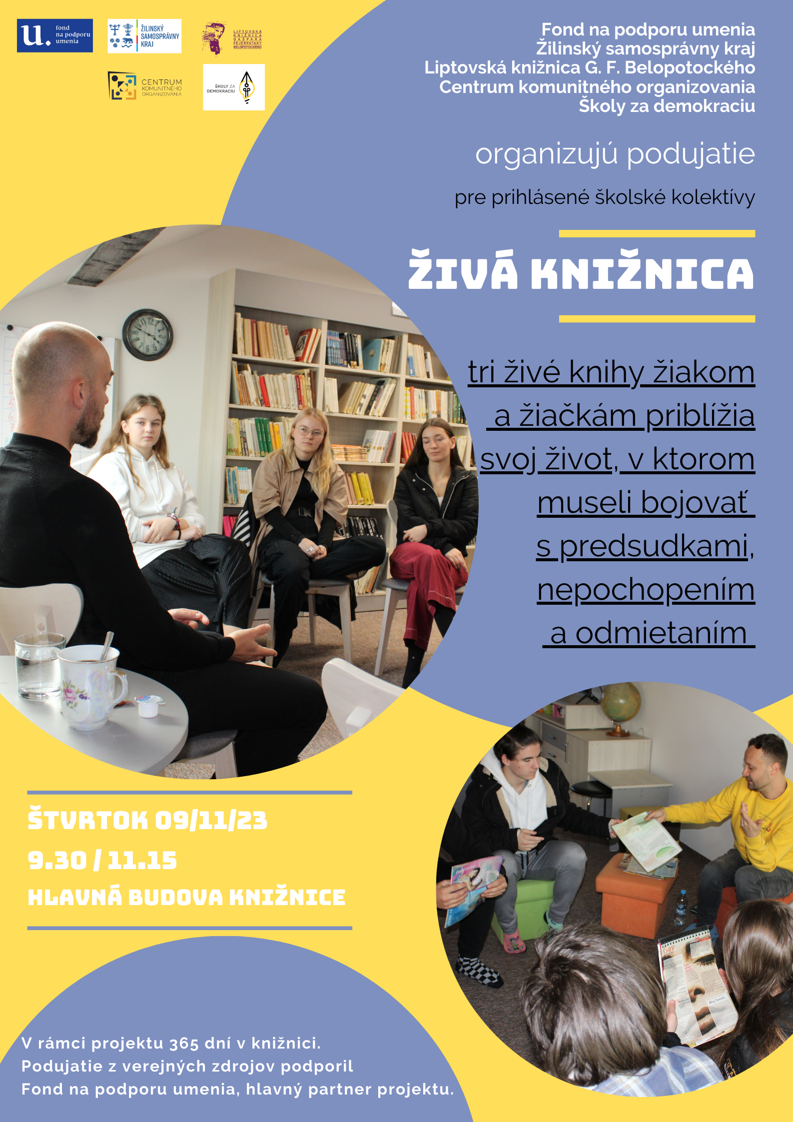 Živá knižnica – tri živé knihy priblížia svoj život, v ktorom museli bojovať s predsudkami, nepochopením a odmietnutím, dva workshopy pre II. stupeň ZŠ, 9. november 2023 o 9.30 hod. a 11.15 hod.