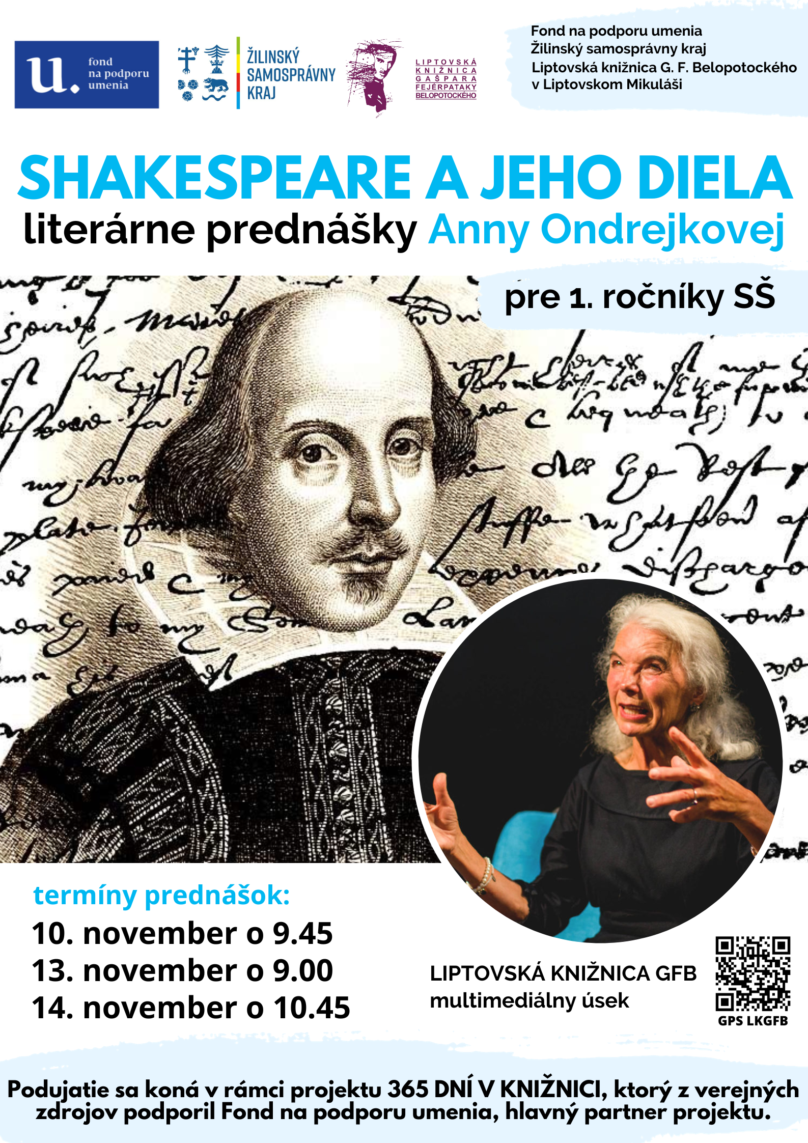 Shakespeare a jeho diela – tri literárne prednášky Anny Ondrejkovej o živote a diele Williama Shakespeare pre študentov 1. ročníka SŠ; 10. novembra o 9.45; 13. novembra o 9.00; 14. novembra o 10.45; v multimediálnom úseku liptovskej knižnice.