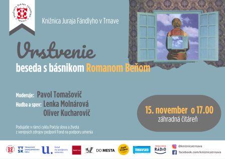 Vrstvenie je názov knižného debutu mladého básnika, laureáta viacerých celoslovenských literárnych súťaží Romana Beňa. Pochádza z Trnavy, študoval tu učiteľstvo na Pedagogickej fakulte Trnavskej univerzity. Pracoval v redakcii časopisu Historická revue, v súčasnosti pôsobí v školstve. Je členom Trnavského literárneho klubu a bratislavského klubu BRAK. Stretnutie s básnikom moderuje Pavol Tomašovič, hudba a spev Lenka Molnárová a Oliver Kucharovič.