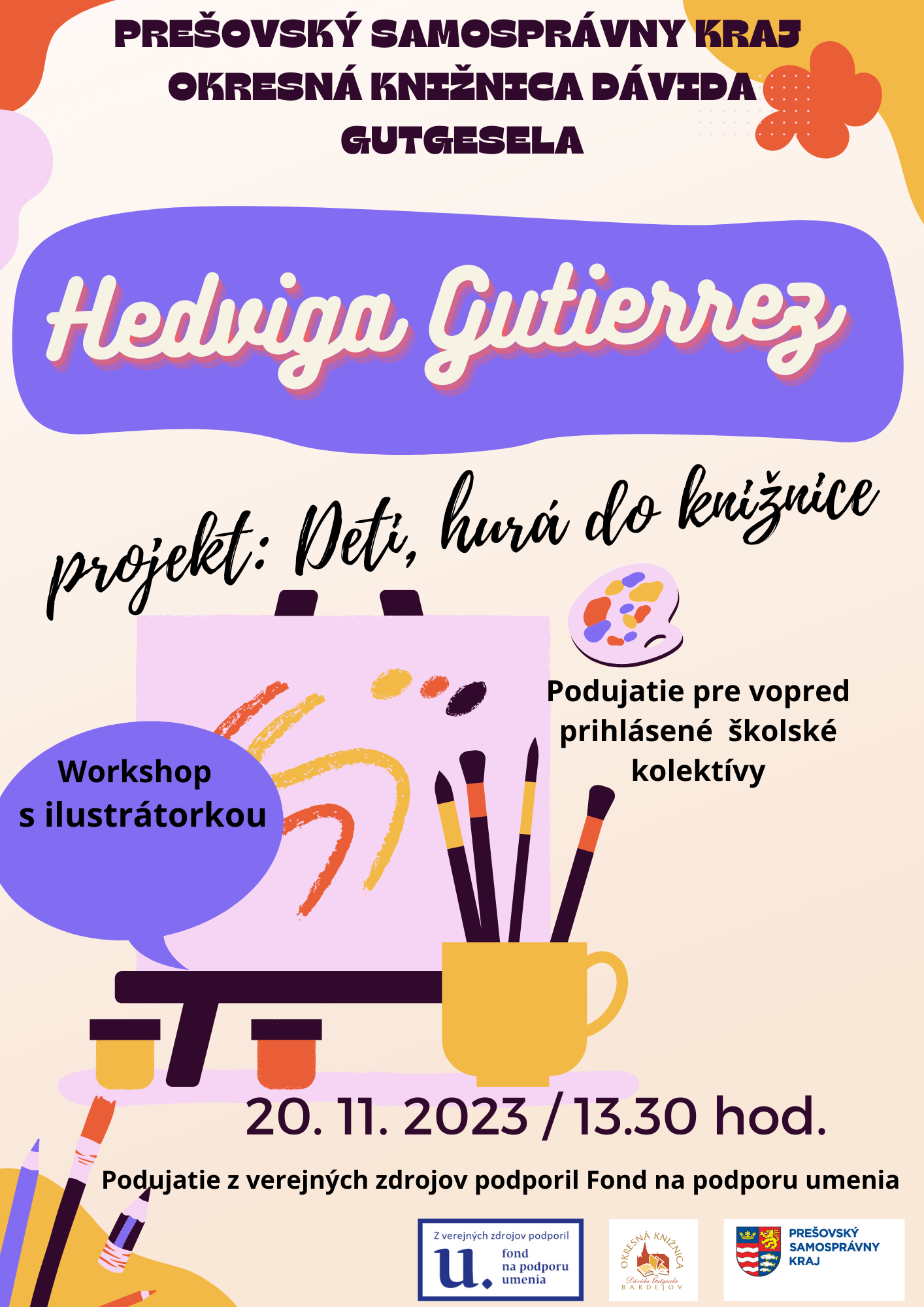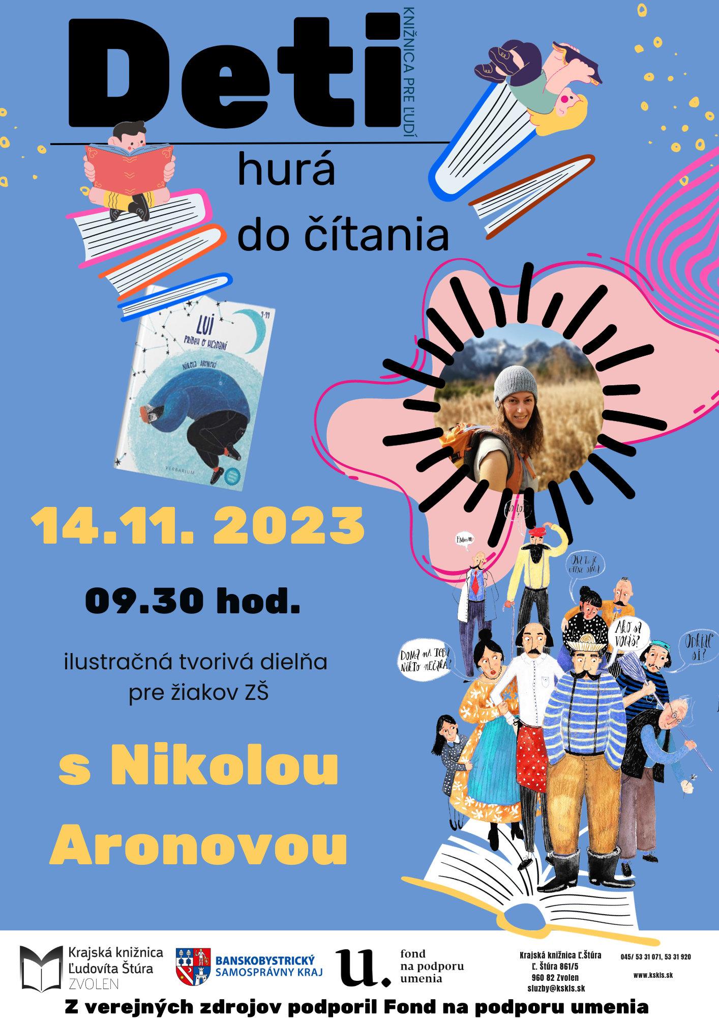 Cyklus Deti hurá do čítania je krajskou knižnicou realizovaný niekoľko rokov. Pozostáva zo stretnutí a ilustračných dielní žiakov ZŠ s tvorcami detských kníh. Tentoraz sa uskutoční ilustračný workshop s Nikolou Aronovou. Vďaka krásnej prírode a kopcom vznikli dve jej autorské knihy o horách a o pokoji v nich. Ilustrovala aj ďalšie detské knihy, venuje sa aj ilustráciám iných kníh, kníhväzbe. Podujatie z verejných zdrojov podporil Fond na podporu umenia.