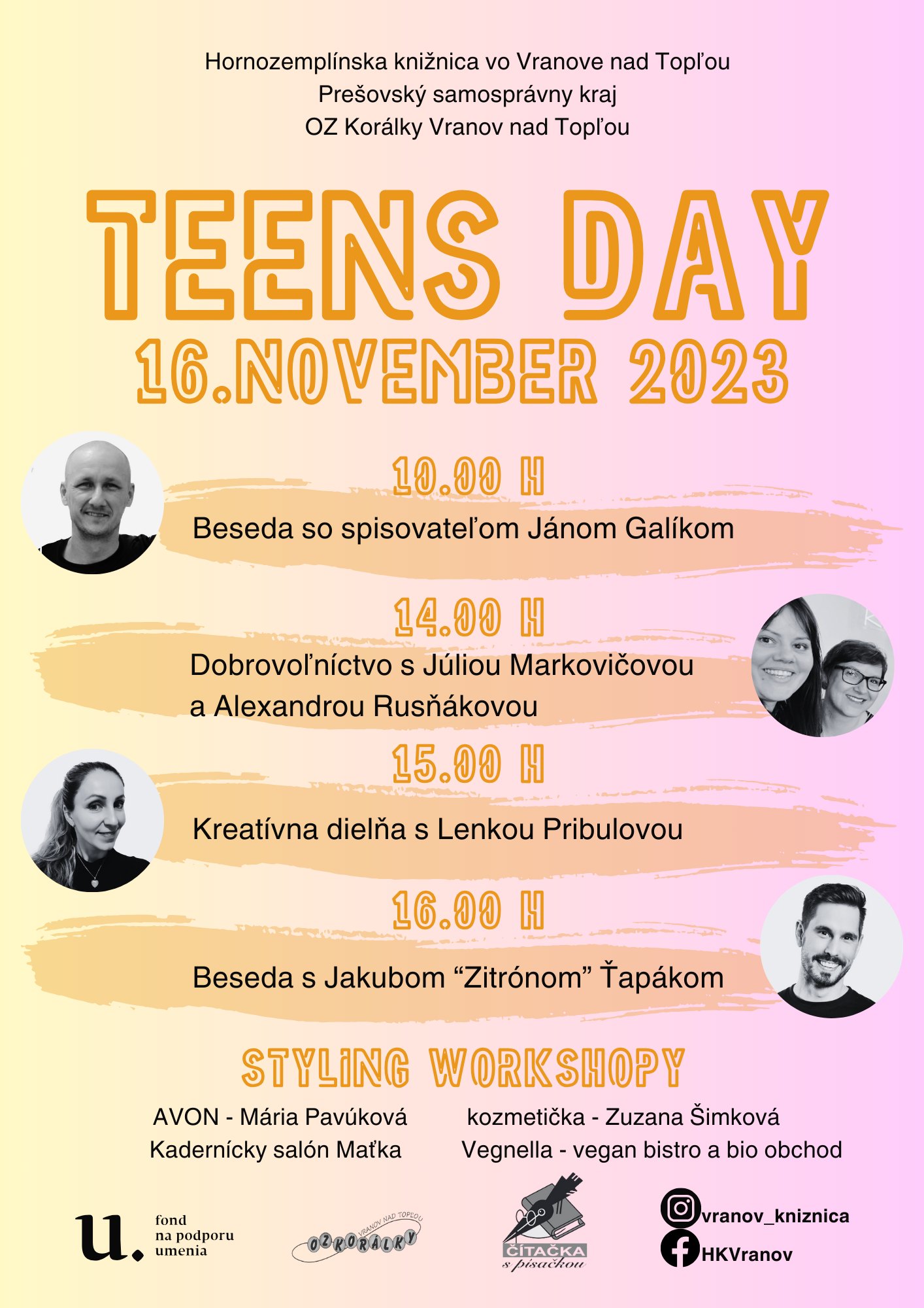 TEENS DAY 23 16. novembra 2023 pozývame všetkých tínedžerov na podujatie s názvom Teens day. Teens day je podujatie venované študentom vo veku od 11 – 19 rokov, pri príležitosti 17. novembra – Dňa študentstva. Cieľom podujatia je osloviť mladých ľudí, ktorých chceme inšpirovať, naučiť a predstaviť im osobnosti z rôznych oblastí spoločenského života