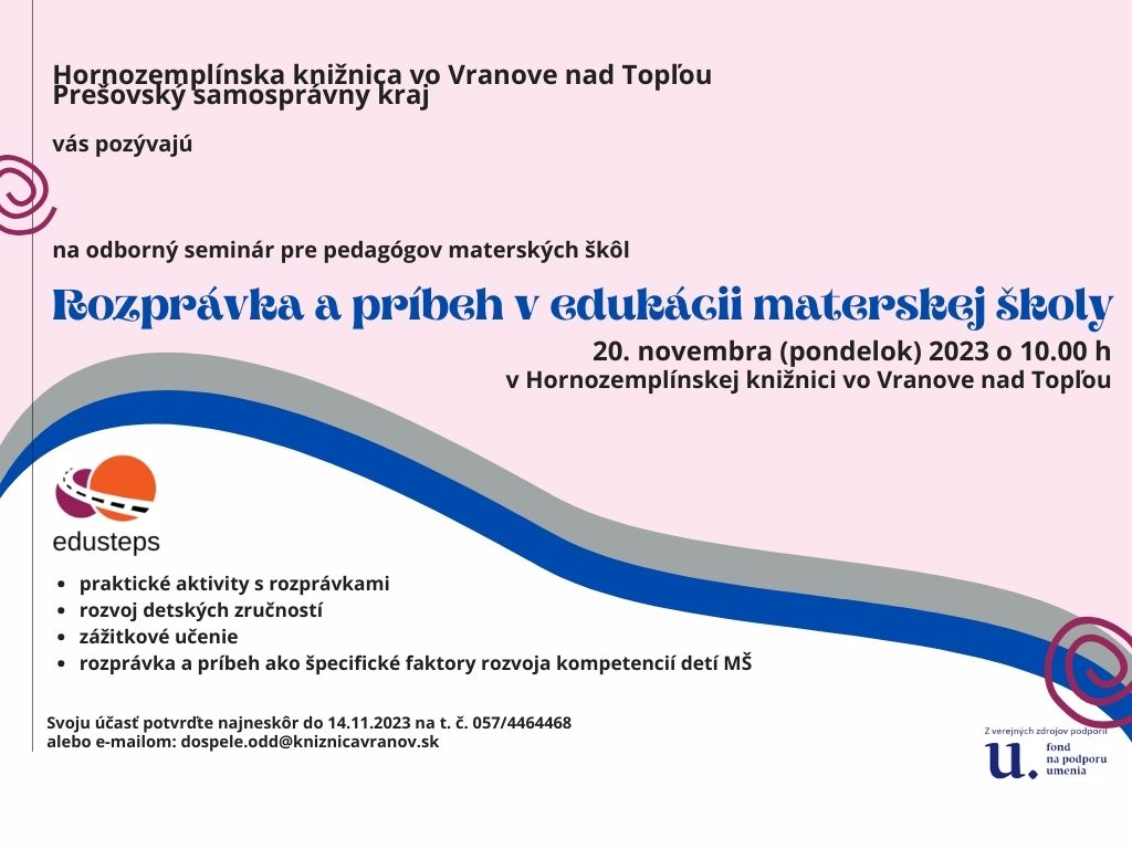 Hornozemplínska knižnica vo Vranove nad Topľou, Prešovský samosprávny kraj pozýva pedagógov materských škôl na odborný seminár na tému Rozprávka a príbeh v edukácii materskej školy, ktorý sa uskutoční 20. novembra 2023 o 10.00 hod. v Hornozemplínskej knižnici vo Vranove nad Topľou.