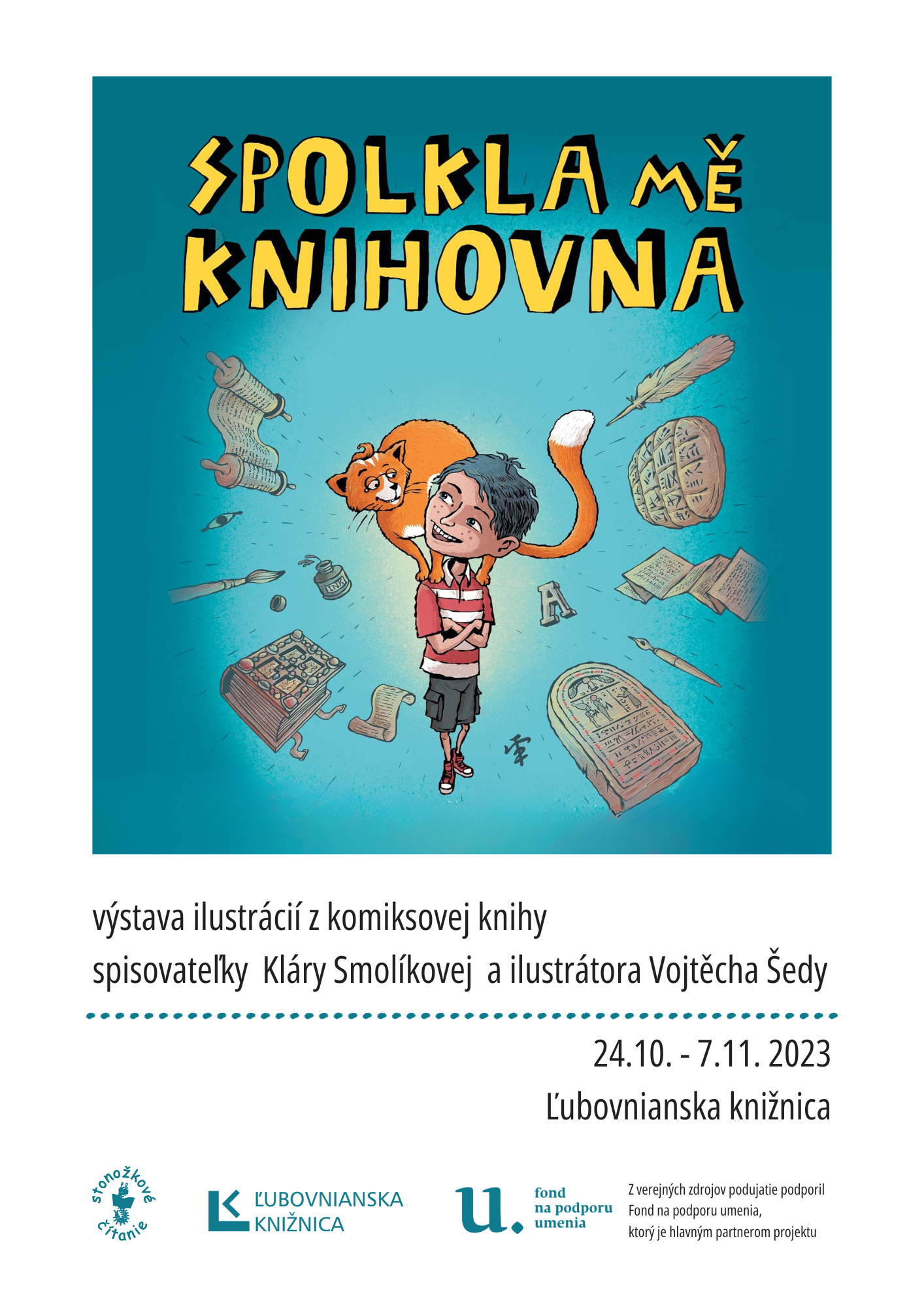 Výstava ilustrácií z komiksovej knihy Spolkla mě knihovna od spisovateľky Kláry Smolíkovej a ilustrátora Vojtěcha Šedy.