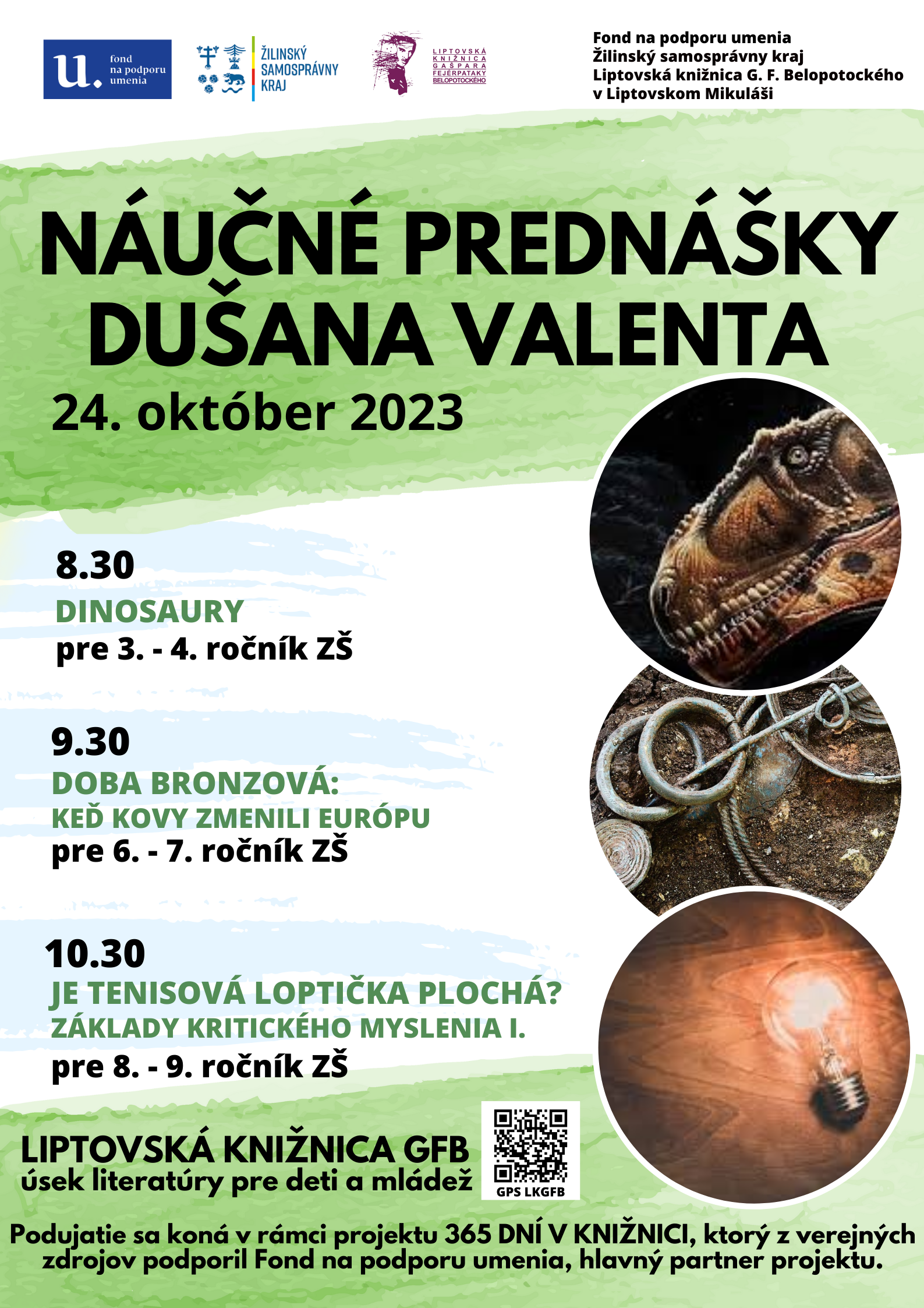 Náučné prednášky Dušana Valenta - Dinosaury. Doba bronzová: keď kovy zmenili Európu. Je tenisová loptička plochá? Základy kritického myslenia I. 3 prednášky pre žiakov I. a II. stupňa ZŠ; 24. októbra 2023 o 8.30 hod, 9.30 hod. a 10.30 hod. v úseku literatúry pre deti a mládež