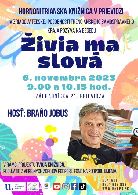 Živia ma slová - nie je veľa ľudí, ktorí si túto vetu môžu povedať. Hosť našich besied, Braňo Jobus, ktorý je nie len spisovateľ, ale aj herec, spevák a hudobník, je jedným z mála. Okrem toho, že prevedie deti svojou rôznorodou literárnou tvorbou, určite predvedie aj svoje ostatné remeslá.