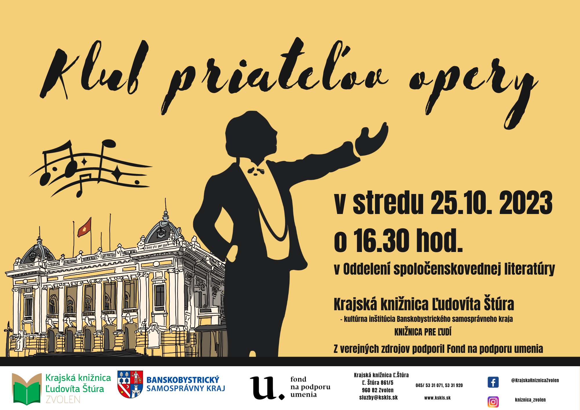 Stretnutia Klubu priateľov opery pri Štátnej opere Banská Bystrica, ktoré sa konajú raz mesačne v poslednú stredu každého mesiaca, si získavajú stále viac sympatizantov. Stretnutie klubu bude prebiehať pod vedením knihovníčky Ruslany Samčukovej z krajskej knižnice. S hosťom podujatia Viktorom Boršom predstavia novinky vo svetových operných domoch. Stretnutie bude spestrené videoprojekciou noviniek zo sveta opery. Vstup je voľný. Podujatie z verejných zdrojov podporil Fond na podporu umenia.