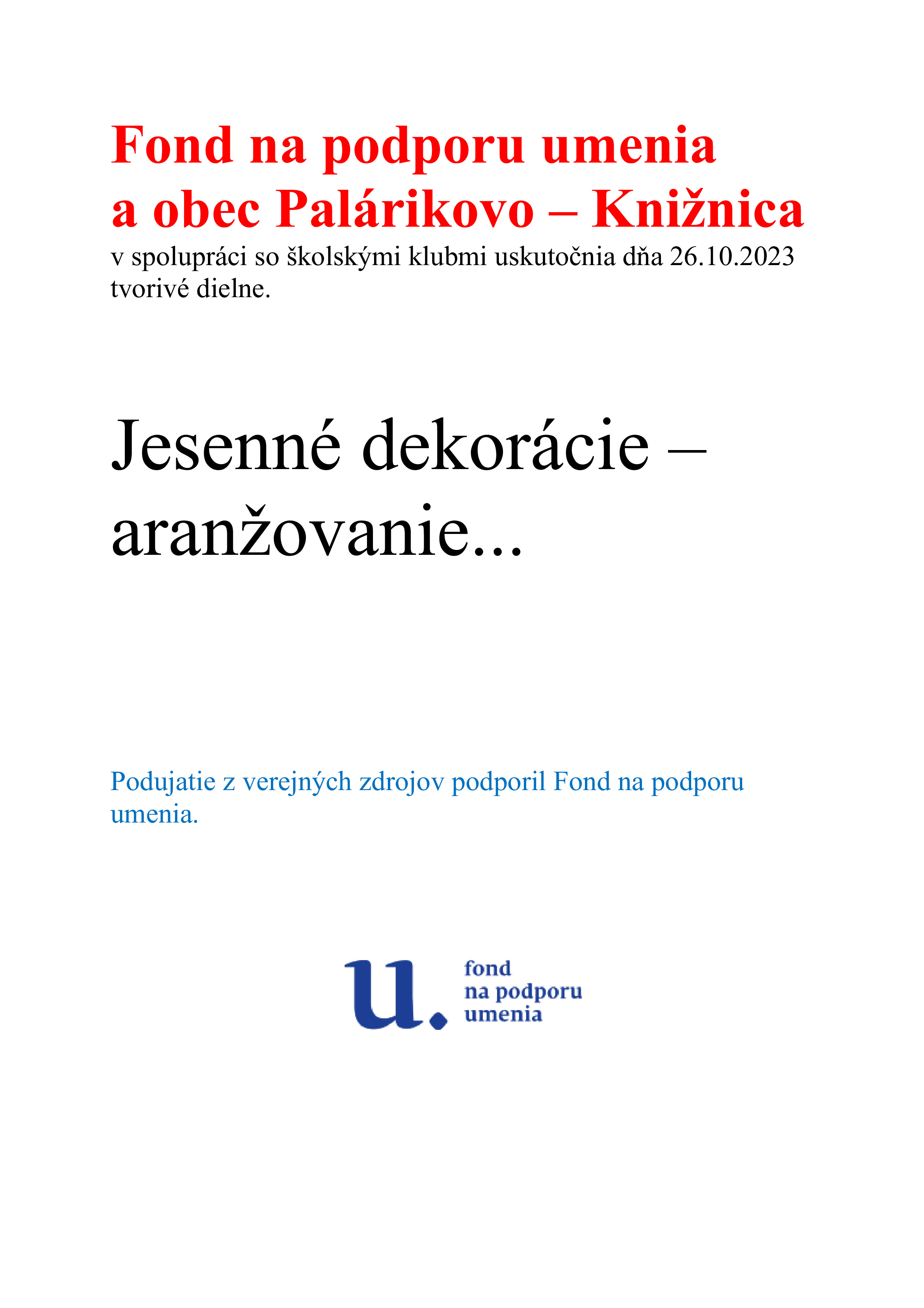 Pozývame deti i dospelých na tvorivé dielne s využitím rôznych techník. Vyrobíme si jesennú výzdobu pred dom, do záhradky i na verejné priestranstvá.