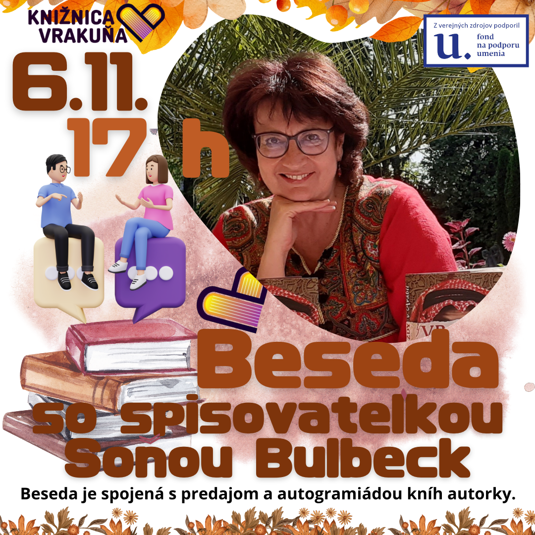Beseda so spisovateľkou Soňou Bulbeck je určená pre širokú verejnosť.