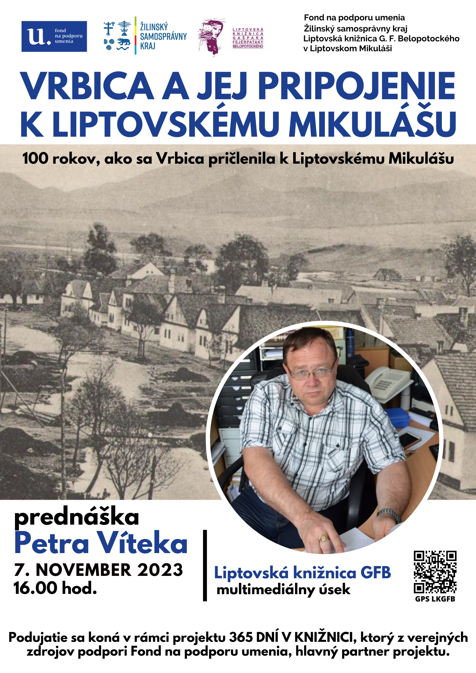 Vrbica a jej pripojenie k Liptovskému Mikulášu, prednáška Petra Víteka k 100. výročiu pričlenenia Vrbice k Liptovskému Mikulášu; 7. november 2023 o 16.00 hod. v priestoroch multimediálneho úseku.