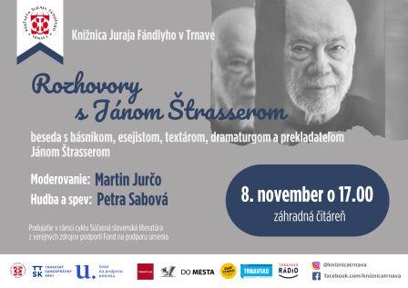 Pozývame vás na besedu s básnikom, esejistom, textárom, dramaturgom a prekladateľom Jánom Štrasserom. V priebehu rokov upútal pozornosť nielen básňami, ale aj ako textár piesní, z ktorých sa mnohé stali hitmi. Patrí tiež k významným prekladateľom ruskej literatúry a nemeckej poézie. Moderátorské otázky si chystá Martin Jurčo, s hudbou a spevom prispeje Petra Sabová.