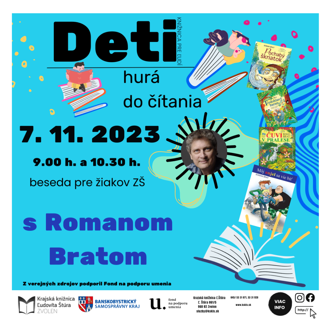 Cyklus Deti hurá do čítania je krajskou knižnicou realizovaný niekoľko rokov. Pozostáva zo stretnutí a ilustračných dielní žiakov ZŠ s tvorcami detských kníh. Tentoraz sa uskutočnia dve besedy so spisovateľom Romanom Bratom, dramaturgom v RTVS, prekladateľom španielskej a latinsko-americkej literatúry a autorom večerníčkového seriálu Čo videli stromy a Rozprávky starého Inku. Podujatie z verejných zdrojov podporil Fond na podporu umenia.