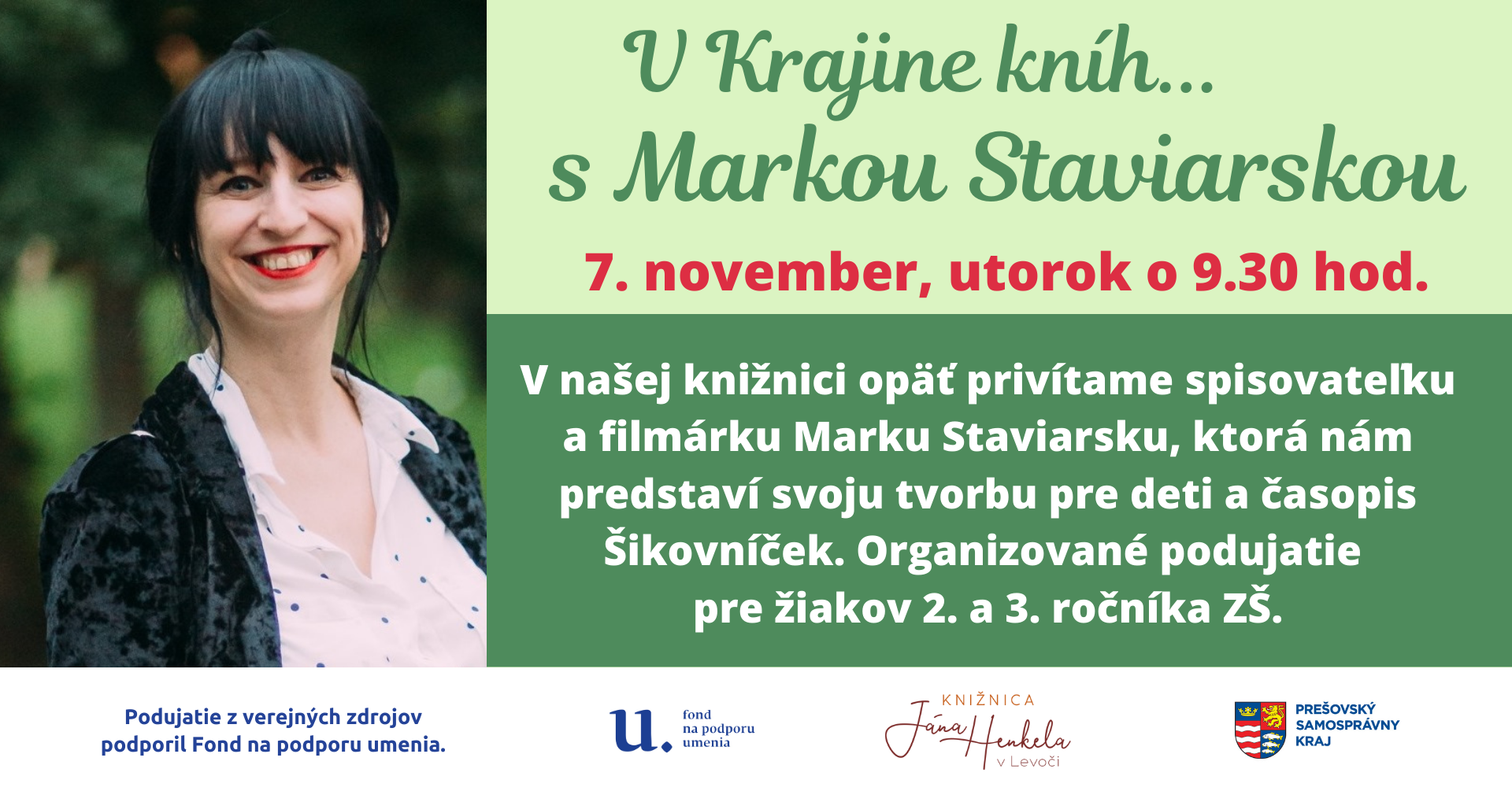 V rámci projektu Krajina kníh si do knižnice pozývame súčasných slovenských autorov a ilustrátorov kníh pre deti a mládež. V novembri prijala pozvanie do našej knižnice spisovateľka a filmárka Marka Staviarska.