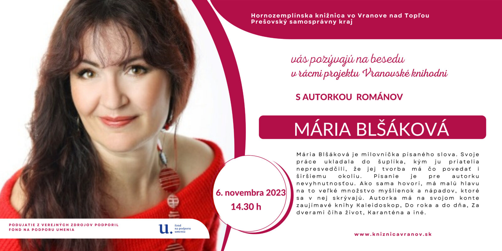 Pozvánka na besedu s Máriou Blšákovou Hornozemplínska knižnica vo Vranove nad Topľou vás pozýva na besedu s autorkou Máriou Blšákovou, ktorá sa uskutoční 6. novembra 2023 o 14.30 hod.