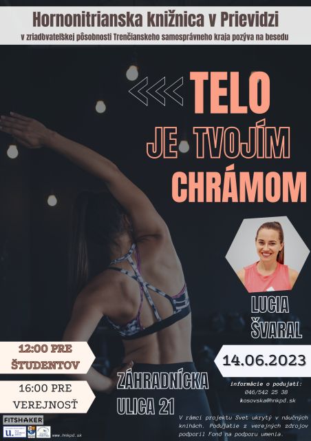 V Hornonitrianskej knižnici na Záhradníckej ulici 21 privítame Luciu Švaral, spoluzakladateľku platformy FITSHAKER, propagátorku športu a zdravého stravovania. Lucia je autorkou série kníh Z fitka do kuchyne a knihy Zdraví papkáči. Budeme sa rozprávať aj o tom, ako sa dá venovať pohybu aj tam, kde nie sú podmienky ideálne a motivovať návštevníkov k rozvíjaniu svojho zdravia.