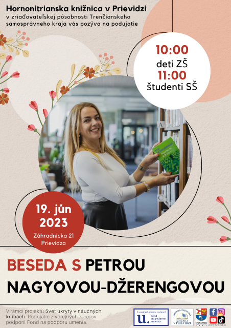 V Hornonitrianskej knižnici v Prievidzi privítajú 19.6. 2013 o 10.00 a 11.00 hodine spisovateľku Petru Nagyovú Džerengovú. Autorka má široký záber spisovateľskej tvorby a aj preto zaujme všetky vekové kategórie. Má fanúšikov od malých školákov, cez veľkých študentov až po dospelákov. Jednu besedu venuje žiakom základnej školy a druhú študentom strednej školy. Obe besedy sa uskutočnia na Záhradníckej 21 v Prievidzi.