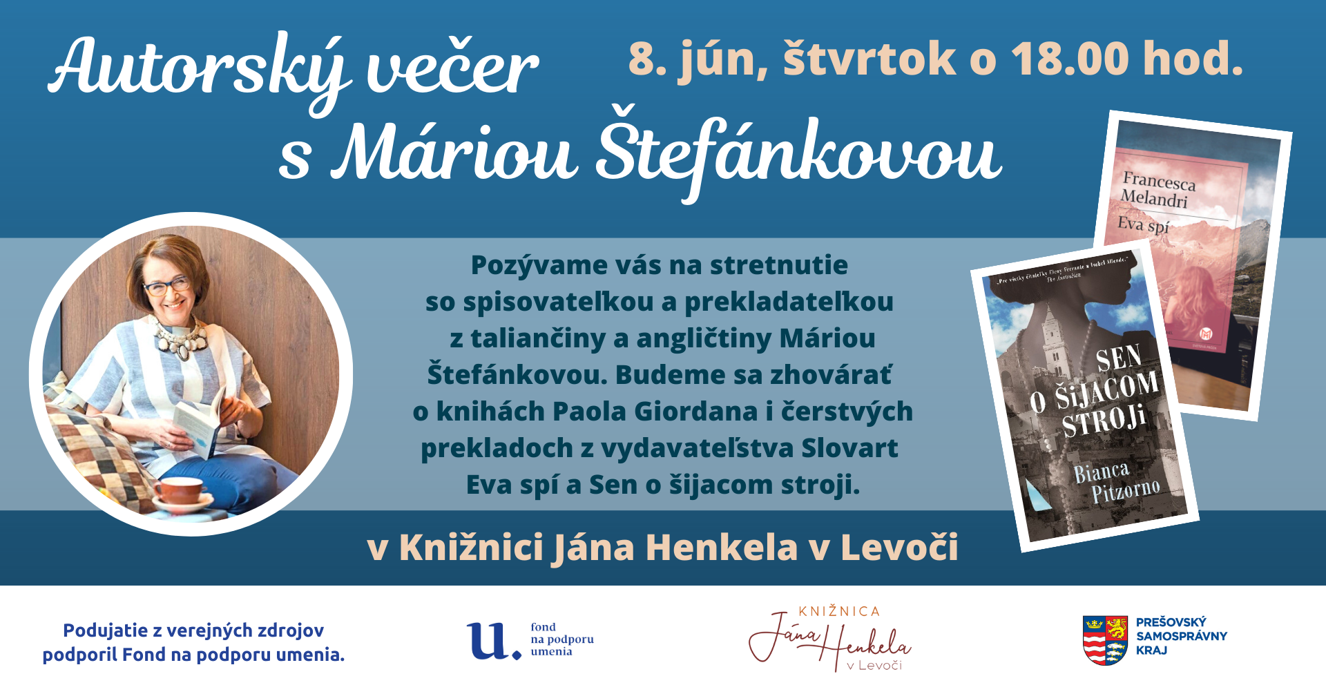 V rámci projektu Autorský večer s... do knižnice pozývame zaujímavých slovenských autorov a prekladateľov. V júni nás navštívi spisovateľka a prekladateľka z taliančiny Mária Štefánková.