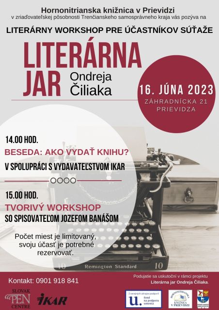 Mladých autorov, ktorí sa zapojili do súťaže Literárna jar Ondreja Čiliaka, pozývame na besedu venovanú tvorbe kníh a na kreatívny workshop s autorom bestsellerov Jozefom Banášom. Aktivity začínajú 16.6.2023 o 14.00 hodine. Podujatie je okrem súťažiacich venované aj širokej verejnosti, primárne ľuďom, ktorí sa chcú zlepšiť v písaní a vydať svoju prvú knihu.