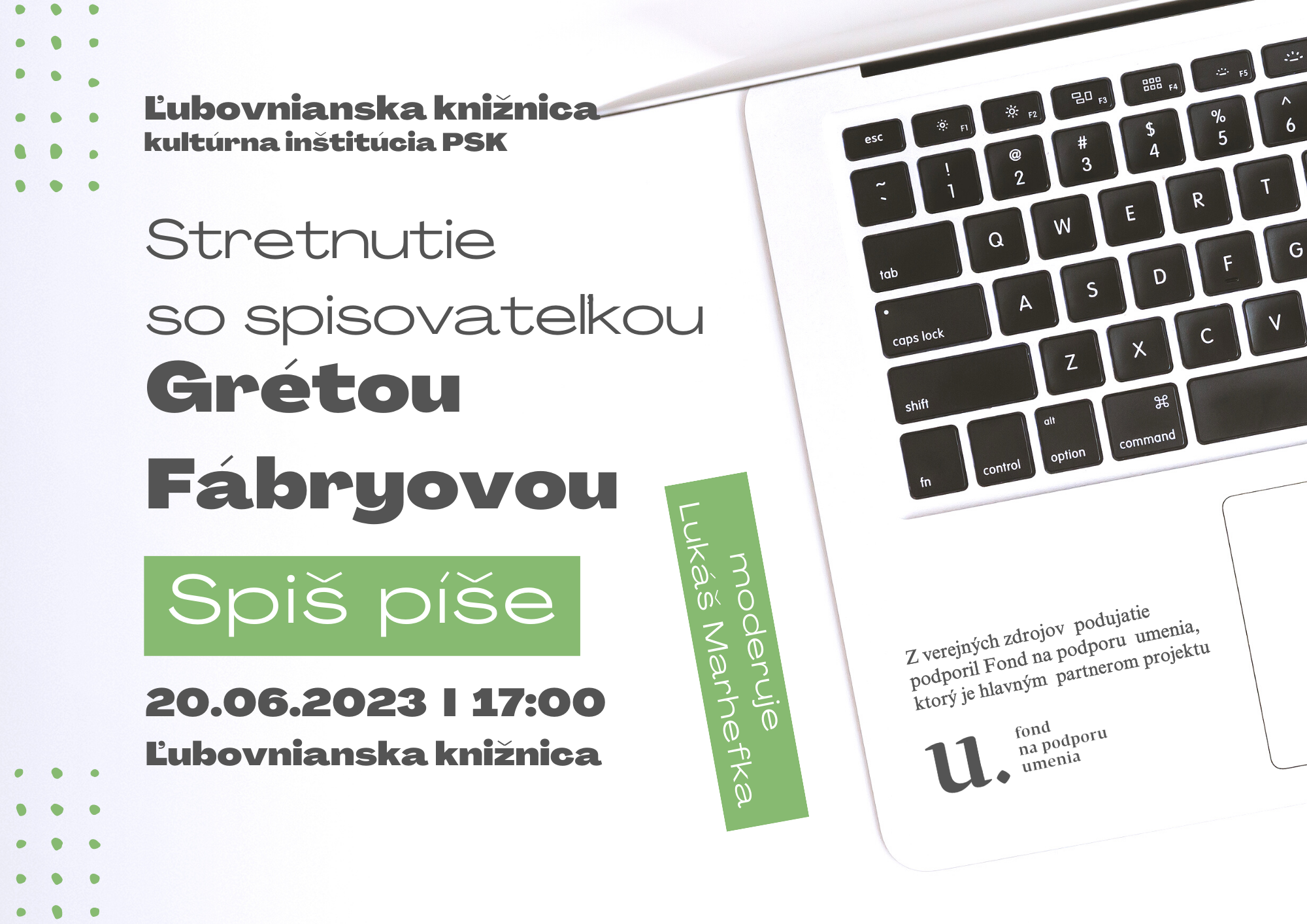 V rámci projektu Spiš píše pokračujeme v cykle šiestich besied so spisovateľmi, ktorí pochádzajú z regiónu Spiš alebo v ňom pôsobia. Tentokrát nám svoju tvorbu predstaví Gréta Fábryová. Moderátor stretnutia Lukáš Marhefka sa okrem iného bude s autorkou rozprávať o tom, ako sa z molekulárnej biologičky stane spisovateľka a ako vznikala kniha Do neba ma nevezmú.
