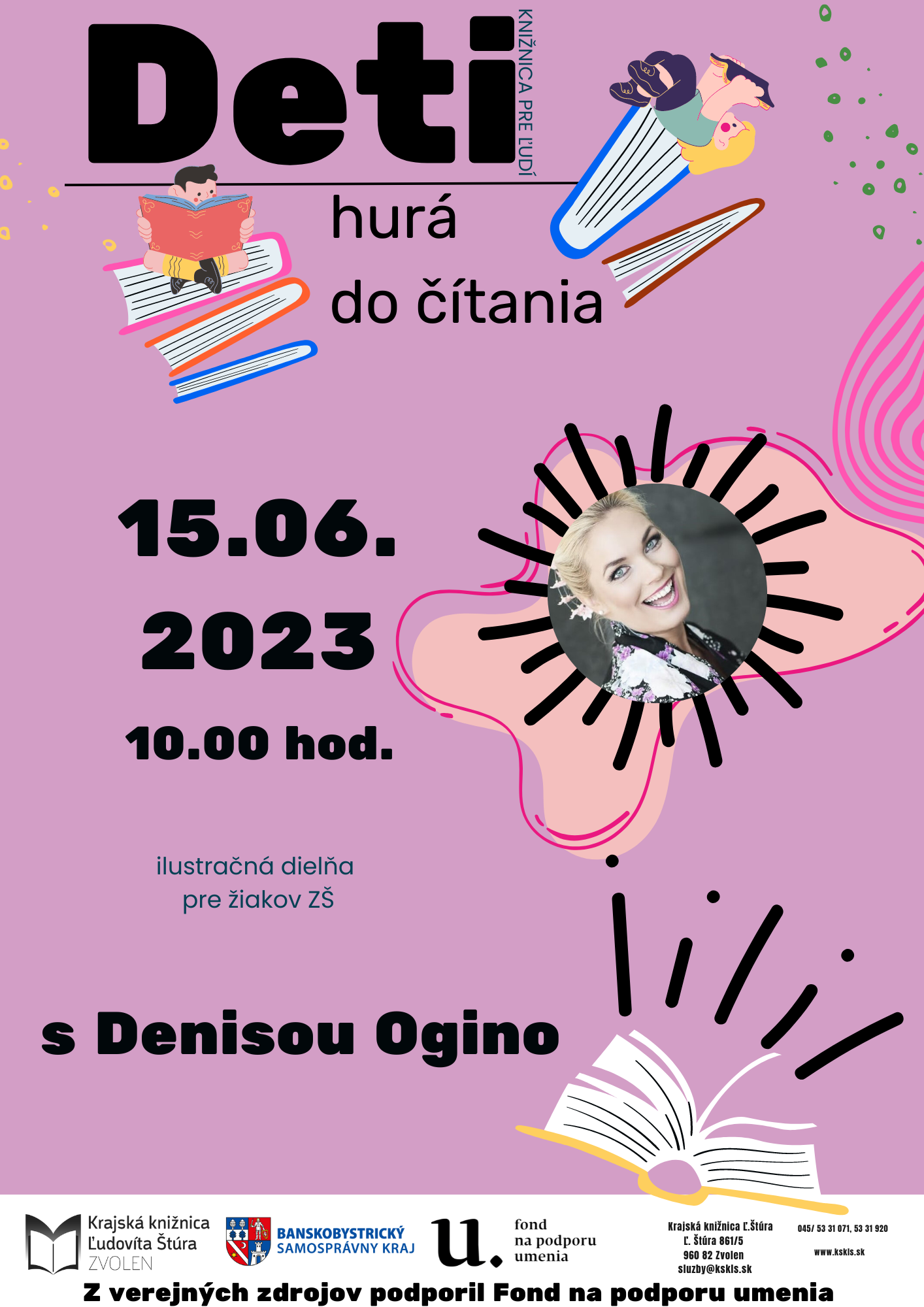 Cyklus Deti hurá do čítania je krajskou knižnicou realizovaný niekoľko rokov. Pozostáva zo stretnutí a ilustračných dielní žiakov ZŠ s tvorcami detských kníh. Tentoraz sa uskutoční ilustračná dielňa pre starších žiakov pod vedením Denisy Cabadaj Ogino, autorky knižky Ogi báje (2023) z prostredia Japonska. Žiaci spoznajú a vyskúšajú si staré umenie písania krásneho písma rukou pomocou štetca na výkresy. Podujatie z verejných zdrojov podporil Fond na podporu umenia.