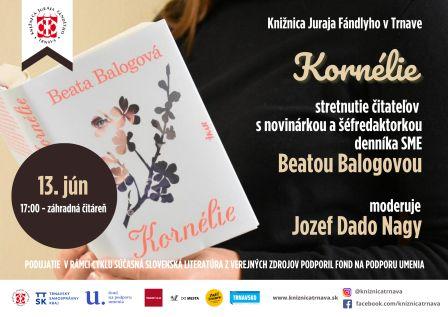 Naša knižnica bude hostiť výnimočnú hostku. Bude ňou Beata Balogová, ktorá patrí k renomovaným slovenským novinárom, v súčasnosti je šéfredaktorkou denníka SME. Literárny publicista Jozef Dado Nagy sa s ňou bude zhovárať o jej debutovom románe Kornélie, ktorý vyvolal nielen veľký čitateľský ohlas, ale aj záujem zahraničných vydavateľov. Ide o autobiograficky ladenú rodinnú ságu niekoľkých generácií silných žien z južného Gemera napísanú v štýle magického realizmu.