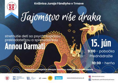 Všetkých detských čitateľov a čitateľky pozývame na stretnutie s psychologičkou, prekladateľkou a spisovateľkou Annou Ďarmati. Je to zároveň maminka troch detí, ktorú práve kombinácia cvičenia detského tai chi na kurzoch a v denných táboroch a zároveň čítanie rozprávok vlastným deťom priviedlo k písaniu detských rozprávok. Sú jemne inšpirované múdrosťou tai chi a ich cieľom je priniesť deťom to, čo sa v tai chi dá nájsť - rovnováhu, uvoľnenie, emocionálnu stabilitu, vnútornú silu, sebadôveru.
