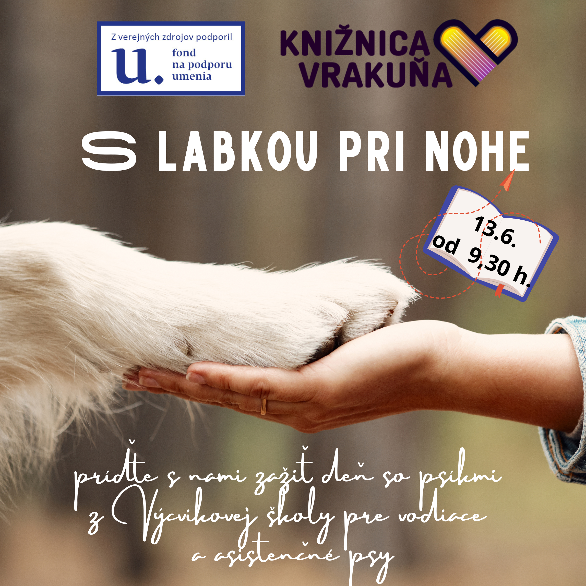S Plutovými štvornohými kamarátmi sa budete môcť stretnúť na ihrisku pri knižnici v utorok 13.6. od 9,30 h. Tréneri z Výcvikovej školy pre vodiace a asistenčné psy Vám vysvetlia pravidlá výcviku štvornohých pomocníkov, ukážu čo všetko je schopný sa psík naučiť a odpovedia na všetky Vaše otázky. Program z verejných zdrojov podporil Fond na podporu umenia.