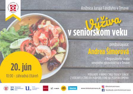 O zdravej výžive počúvame v súčasnosti zo všetkých strán, máme množstvo informácií o zdravej výžive detí a mládeže, o výžive tehotných a dojčiacich žien, o výžive športovcov a pod., ale výžive seniorov sa osobitná pozornosť nevenuje. V spolupráci s Regionálnym úradom verejného zdravotníctva pripravili špeciálne pre seniorov, ale aj pre širšiu verejnosť, prednášku na tému: Výživa v seniorskom veku. Prednášať bude odborníčka z Regionálneho úradu verejného zdravotníctva v Trnave Andrea Šimorová.