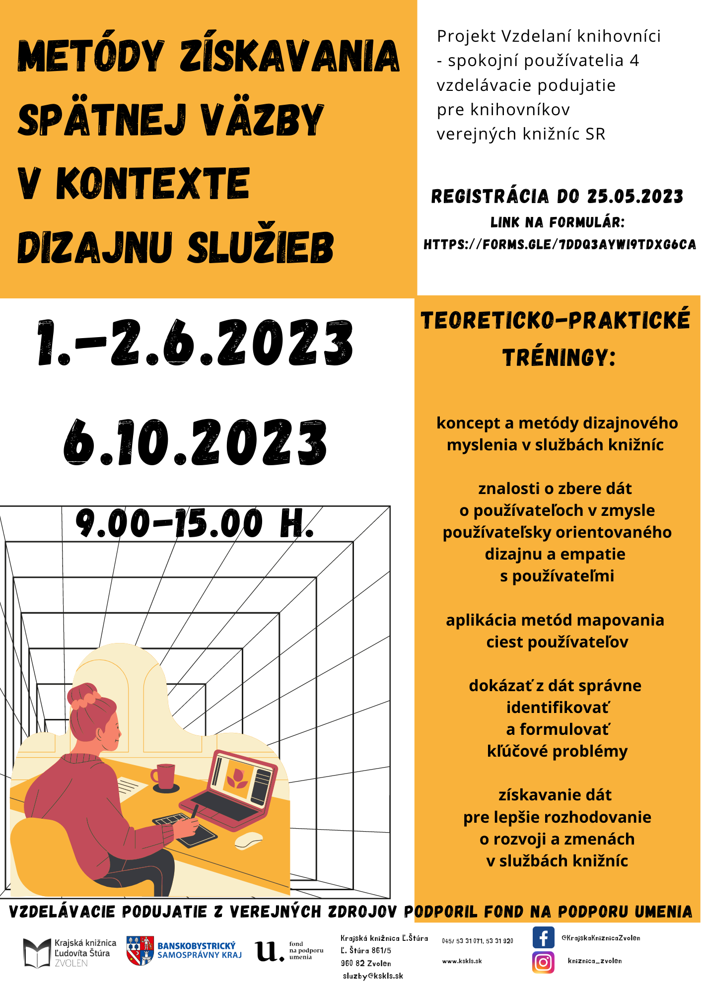 Trojdňový teoreticko-praktický tréning na ktorom sa knihovníci z verejných knižníc oboznámia s konceptom a metódami dizajnového myslenia v službách knižníc; rozšíria si znalosti o zbere dát o používateľoch v zmysle používateľsky orientovaného dizajnu a empatie s používateľmi; budú aplikovať metódy mapovania ciest používateľov; ako dokázať z dát správne identifikovať a formulovať kľúčové problémy; naučia sa získavať dáta pre lepšie rozhodovanie o rozvoji a zmenách v službách knižníc.