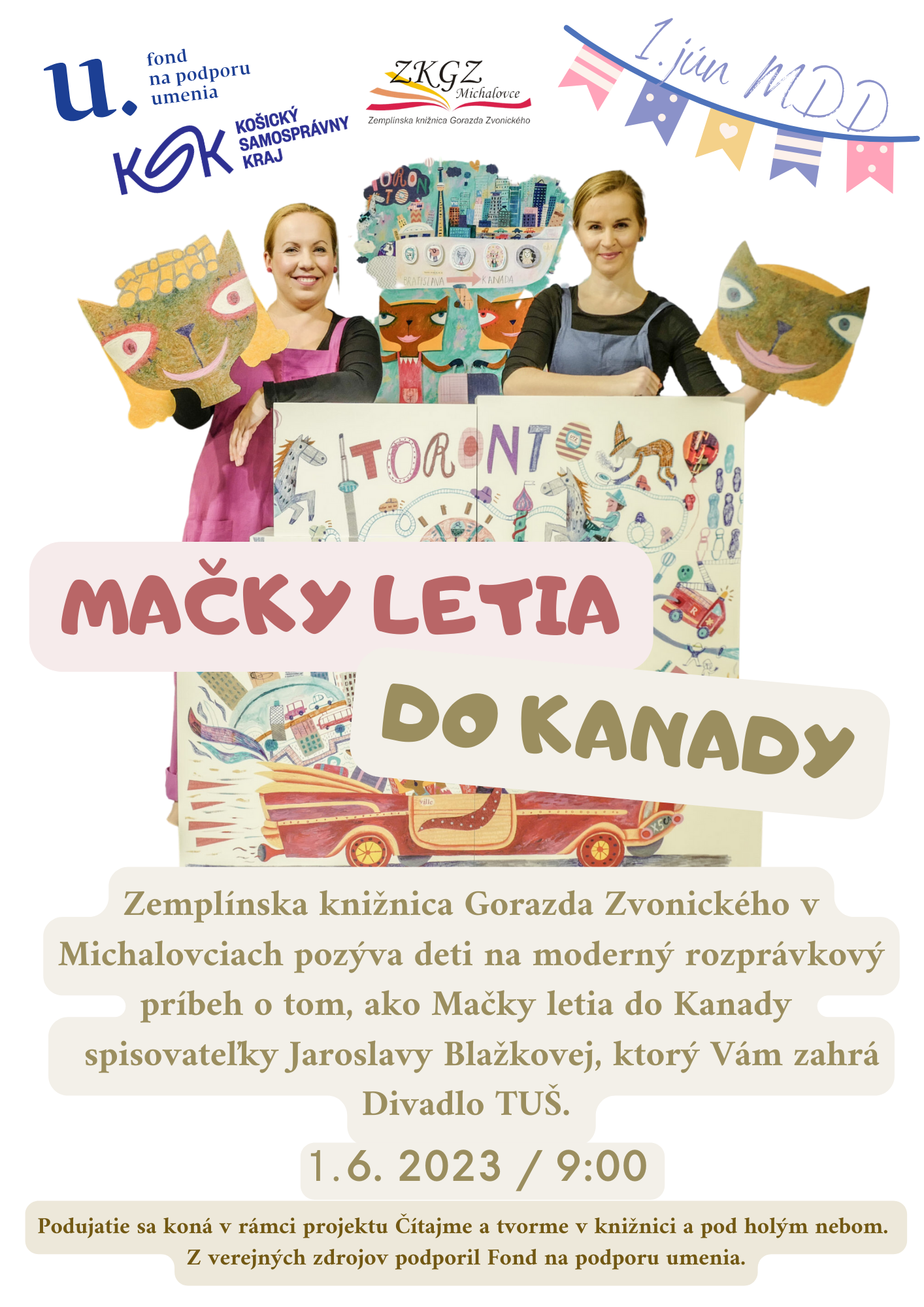Moderný rozprávkový príbeh o tom, ako Mačky letia do Kanady úspešnej slovenskej spisovateľky Jaroslavy Blažkovej v podaní Divadla TUŠ.