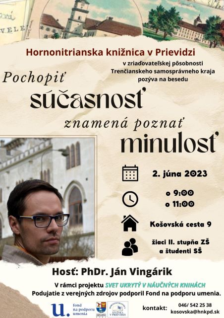 Poznávanie dejín a historických súvislostí nám pomáha pochopiť nielen minulosť, ale aj súčasný svet. Regionálny historik PhDr. Ján Vingárik na besede “Pochopiť súčasnosť znamená poznať minulosť “, ktorá sa bude konať 2. júna 2023, o 9:00 a 11:00 v priestoroch Hornonitrianskej knižnice v Prievidzi, na Košovskej ceste 9, porozpráva o bohatej histórii mesta Prievidza a zaujímavých udalostiach, ktoré počas stáročí formovali jej rozvoj.