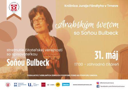 Spisovateľka Soňa Bulbeck je čitateľskej verejnosti známa predovšetkým ako autorka kníh z prostredia Saudskej Arábie a ďalších krajín Blízkeho Východu. V Rijáde, hlavného mesta Saudskej Arábie, žila šesť rokov. Tu začala aj písať a v roku 2013 vyšiel jej prvý román Ženy z Rijádu, inšpirovaný osudmi slovenských a českých žien, žijúcich práve v tomto meste. O jej pohľade na súčasnú kultúru či svet sa dozviete, ak prijmete pozvanie na stretnutie s touto zaujímavou ženou a spisovateľkou.