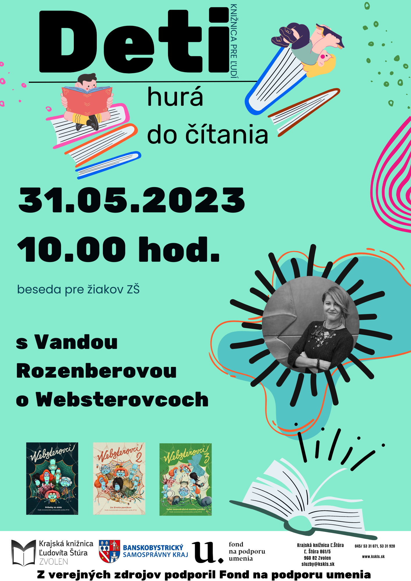 Cyklus Deti hurá do čítania je krajskou knižnicou realizovaný niekoľko rokov. Pozostáva zo stretnutí a ilustračných dielní žiakov ZŠ s tvorcami detských kníh. Tentoraz sa uskutoční stretnutie detí so spisovateľkou Vandou Rozenbergovou, spoluautorkou kníh a večerníčkov o Websterovcoch.
