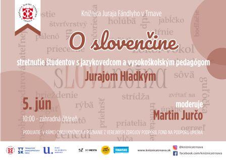 V rámci cyklu Knižnica a poznanie pozývame študentov stredných škôl na stretnutie s jazykovedcom a vysokoškolským pedagógom Jurajom Hladkým. Prednášku, na ktorej náš hosť objasní etymológiu názvov obcí, vodných tokov, vrchov, ale i mien ľudí v našom regióne, moderuje redaktor RTVS Martin Jurčo.