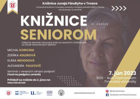 Po úspešnom seminári, ktorý ponúkla Knižnica Juraja Fándlyho v Trnave knihovníkom v roku 2022 prichádzame s pokračovaním vo vzdelávacom programe a pozývame všetkým záujemcov a záujemkyne o vzdelávanie knihovníkov na odborný seminár pod názvom Knižnice seniorom II. Prednášajúci: Zdeňka Adlerová, Michal Koricina, Klára Nehodová, Alexandra Palkovič. Podujatie organizujeme v spolupráci s Krajskou pobočkou Spolku slovenských knihovníkov a knižníc.