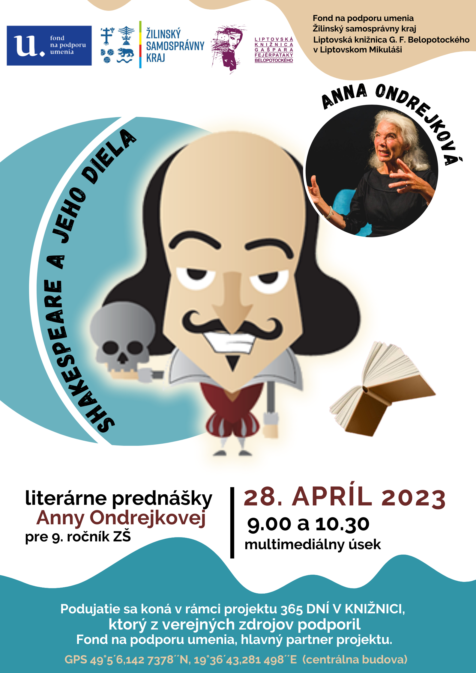 Shakespeare a jeho diela – dve literárne prednášky Anny Ondrejkovej o živote a diele Williama Shakespeare, pre žiakov 9. ročníka ZŠ; 28. apríl 2023 o 9.00 a 10.30 hod.