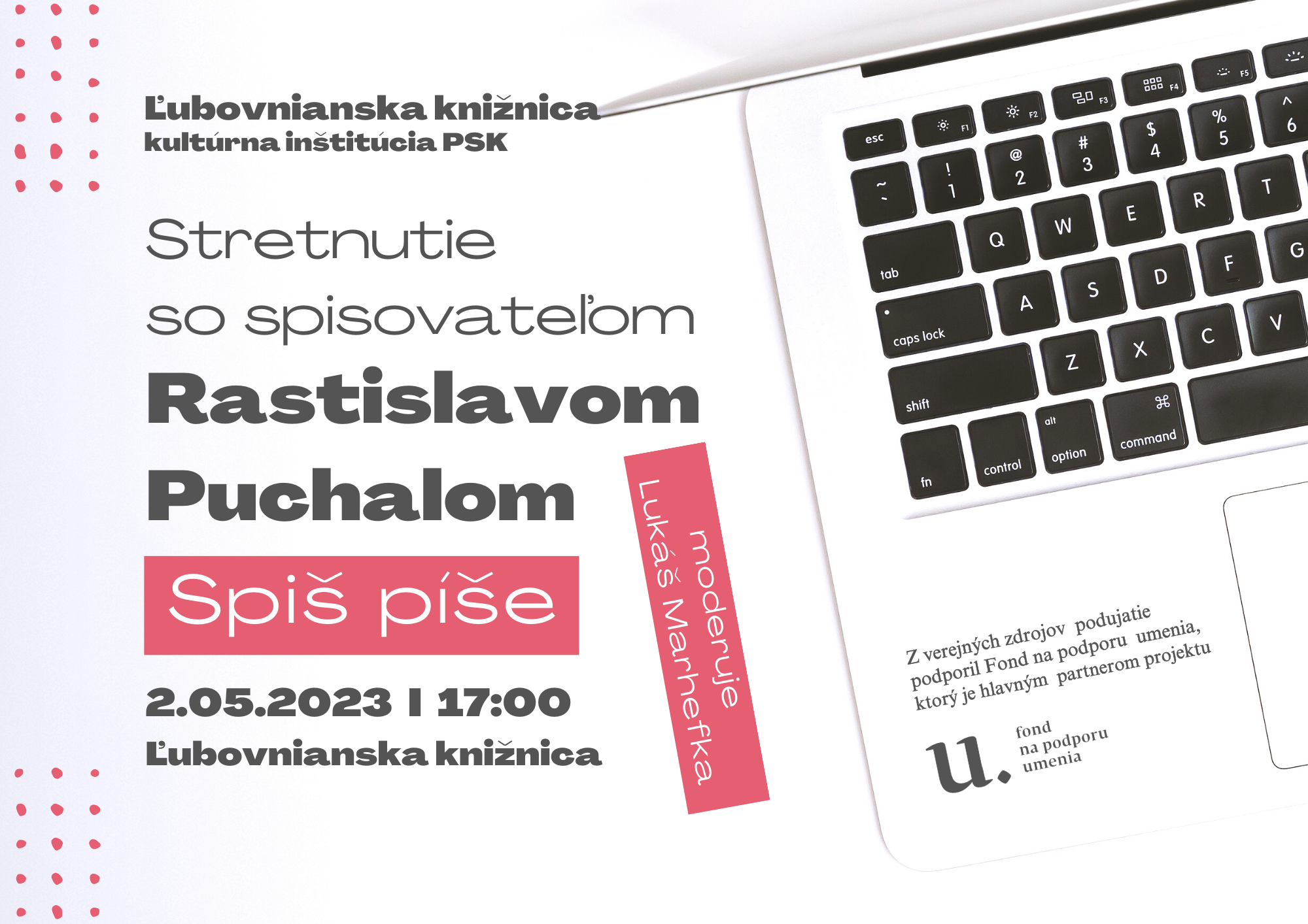 V rámci projektu Spiš píše organizujeme cyklus šiestich besied so spisovateľmi, ktorí pochádzajú alebo pôsobia v regióne Spiš. Účastníkom prvej besedy bude Rastislav Puchala, ktorý nám predstaví svoju tvorbu. Moderátorom stretnutia bude Lukáš Marhefka a program bude doplnený hudobným vystúpením žiakov zo ZUŠ Jána Melkoviča v Starej Ľubovni.