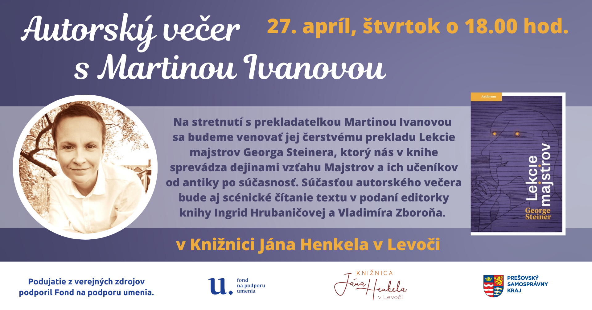 V rámci projektu Autorský večer s... sme pre vás pripravili sériu stretnutí so zaujímavými slovenskými autormi literatúry a prekladateľmi. V apríli nás navštívi prekladateľka Martina Ivanová, s ktorou sa budeme venovať jej čerstvému prekladu Lekcie majstrov Georga Steinera.