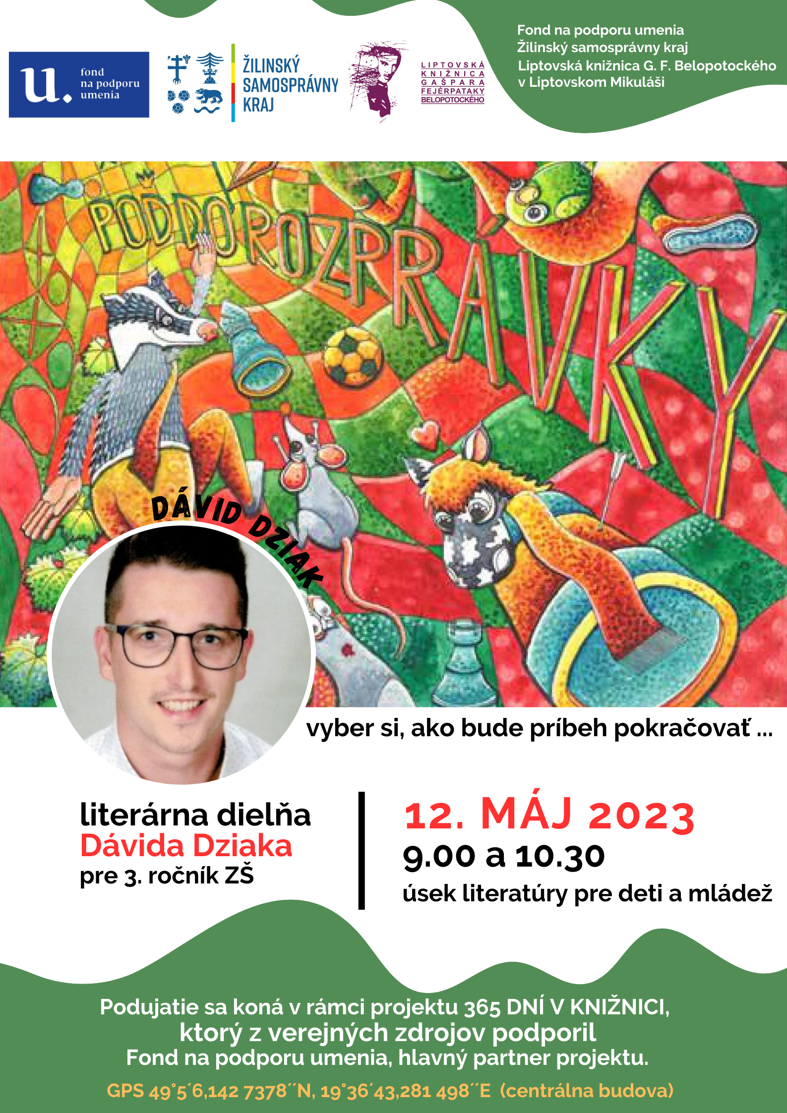 Poď do rozprávky – vyber si, ako bude príbeh pokračovať ... Literárna dielňa Dávida Dziaka (2x); pre žiakov 3. ročníka ZŠ; 12. máj 2023 o 9.00 a 10.30 hod.