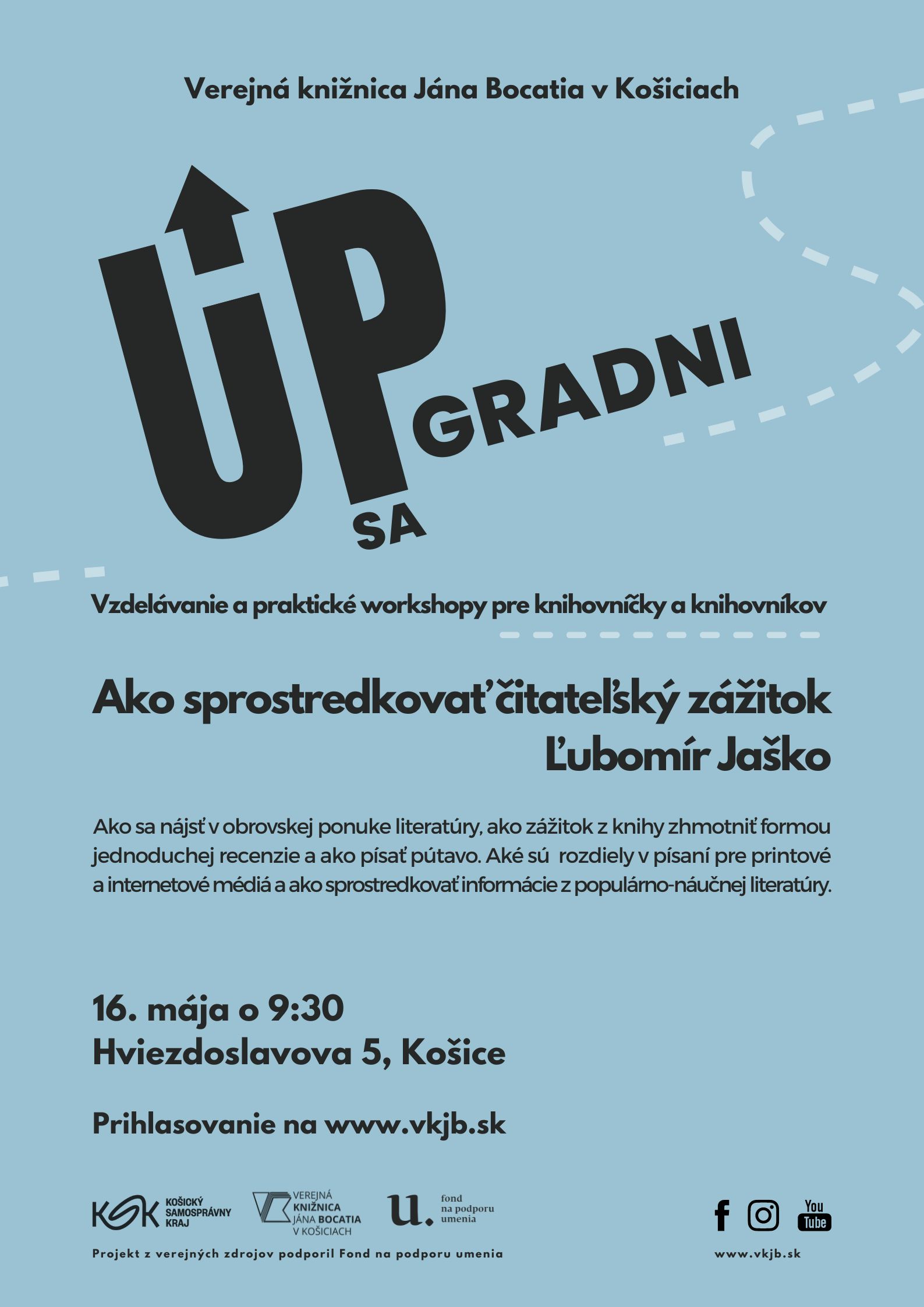 Upgradni sa a zvýš svoje profesijné a osobnostné kompetencie. Verejná knižnica Jána Bocatia v Košiciach pozýva knihovníčky a knihovníkov na odborné vzdelávanie, ktoré pripravila. V rámci projektu Upgradni sa, si kladie za cieľ prispieť k rozvoju ich odborných znalostí tak, aby dokázali v kvalitnejšom pracovnom prostredí poskytovať verejnosti lepšie služby.
