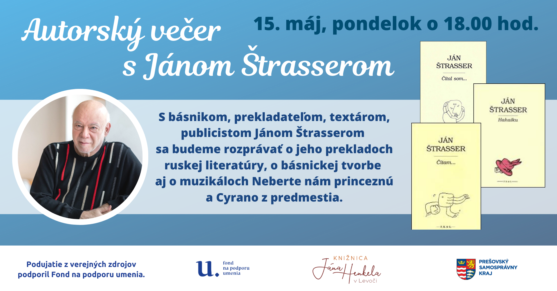 V rámci projektu Autorský večer s... do knižnice pozývame zaujímavých slovenských autorov a prekladateľov. V máji nás navštívi básnik, prekladateľ, textár a publicista Ján Štrasser.