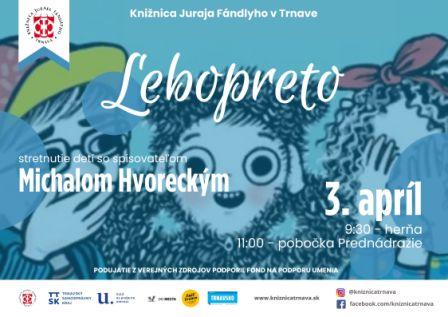 Michal Hvorecký sa porozpráva s detskými čitateľmi a čitateľkami o svojej novej knihe LEBOPRETO. Je to však kniha určená nielen pre deti, ale aj pre rodičov! Po narodení malej Almy sa Martinov svet prevráti naruby. Spolu so sestrou Editou si musia zvyknúť na život s novými radosťami aj povinnosťami. Spoločne sa učia, čo je dobré a čo zlé, čo je spravodlivé a čo nie, ako sa rozhodovať, ako prekonávať strach a prečo nie je hanbou pomýliť sa.