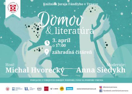 Spisovateľa a prekladateľa Michala Hvoreckého netreba našim čitateľom a čitateľkám osobitne predstavovať. Mnohými literárnymi cenami ovenčený autor píše poviedky, romány a publicistiku. Jeho knihy vyšli v prekladoch do desiatich jazykov. Stretnutie bude tentokrát moderovať Ukrajinka žijúca v Trnave Anna Siedykh, ktorá ho bude pýtať najmä na jeho preklad románu Domov od Judith Hermann, ale aj na jeho pohľad na literatúru a súčasnú spoločnosť.