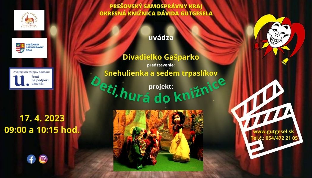 Bábkové predstavenie Snehulienka a sedem trpaslíkov v čase o 9:00 hod. a 10:15. hod. Účinkuje Divadielko Gašparko.